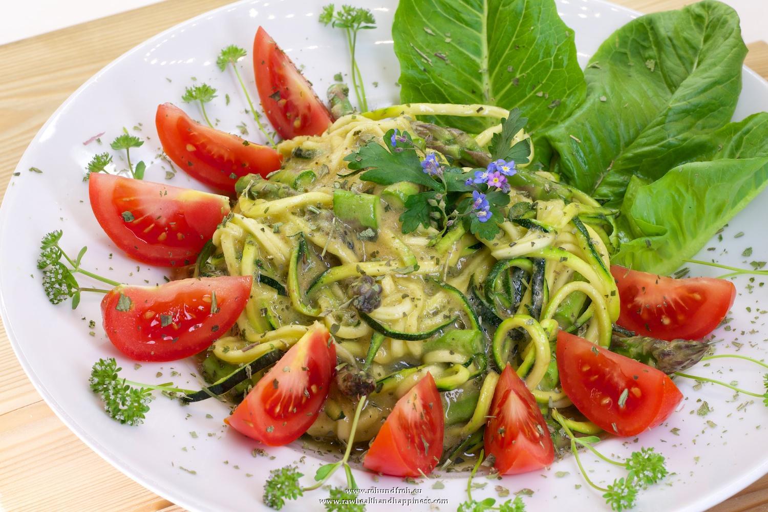 Today I made myself noodles of zucchini with asparagus, romaine lettuce from my garden, forget-me-nots, parsley, lamb's lettuce blossoms, tomatoes and a cream of seven bananas, two pounds of peaches and a hand full of parsley.