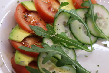 Just a simple snack this time. Half an avocado, a piece of cucumber, one tomato, everything sliced up, some arugula added. You may also want to add some lemon juice.