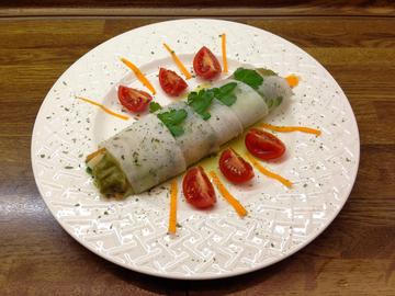 - Slice daikon radish, zucchini or eggplant with your Mandoline - Slicer in thin and long slices and place them overlapping on a plate