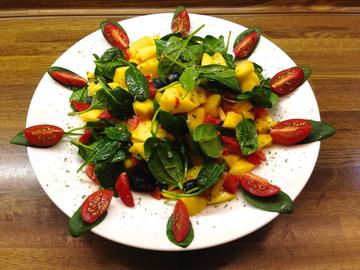 Tonight I made myself an excellent salad with a bowl of young spinach, three diced mangoes, a cup of blueberries and some diced tomatoes. No extra dressing was used for this salad, mangoes and tomatoes were juicy enough! <3