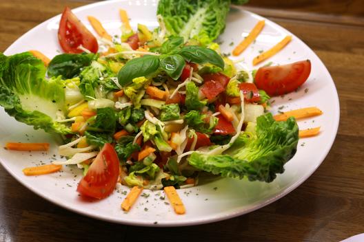 Just now I had a huge bowl of salad with two cut mangoes, two diced carrots, half a diced cucumber, some thinly sliced cabbage, a few cut tomatoes, fresh basil, some baby - lettuce and the juice of one orange and one lemon. This yielded two of these plates.