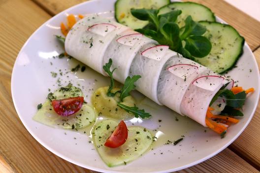 - Slice daikon radish, zucchini or eggplant with your Mandoline - Slicer in thin and long slices and place them overlapping on a plate