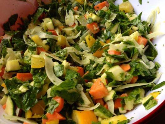 Spinach, fennel, carrots and yellow pepper with avocado and lemon massaged in and a tiny bit of parsley, chives and dill
