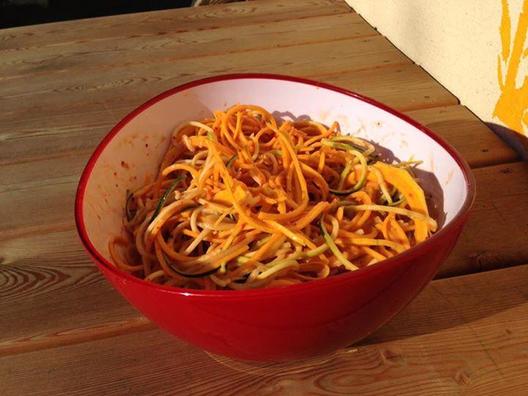 This is a big bowl of most delicious butternut, zucchini and cucumber noodles with a indescribable good sauce of tomatoes, avocado, nectarine, lemon and basil. The sauce is something I never tasted before, maybe the best sauce I ever tasted. ☀❤