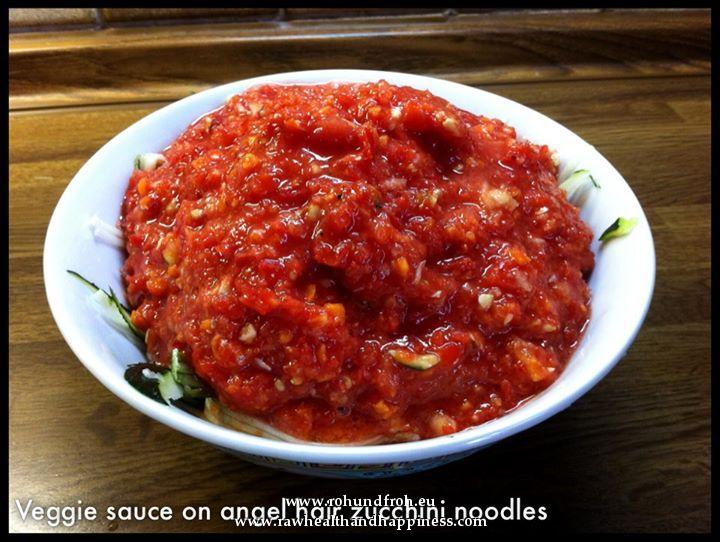 Veggie sauce on angel hair zucchini noodles - sauce was red pepper, tomato, carrot, hazelnut, zucchini